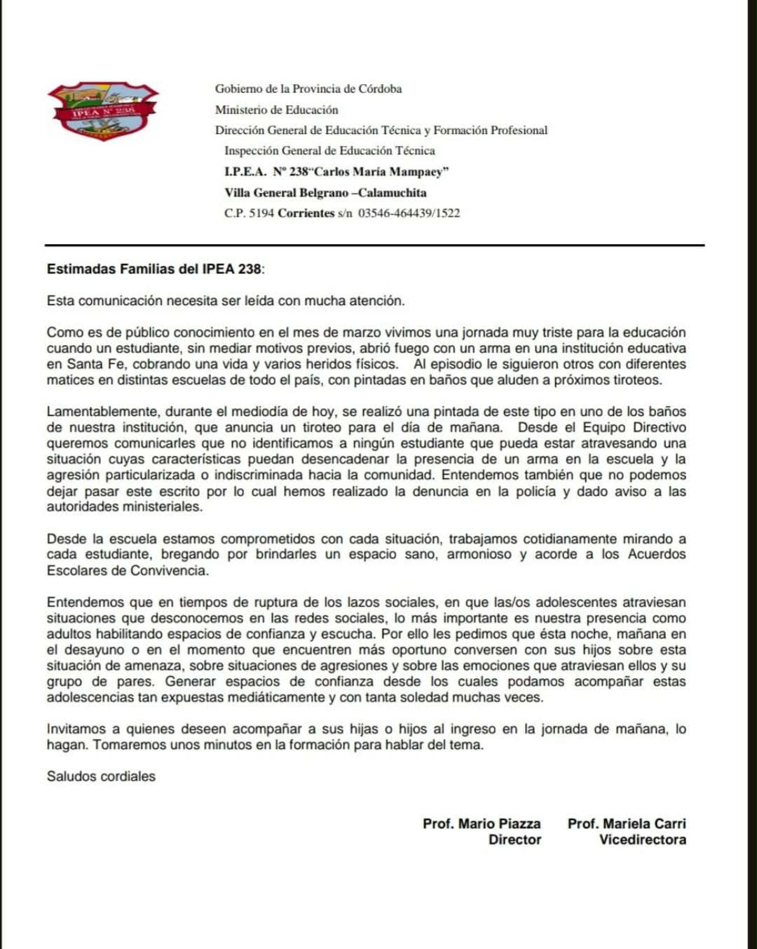 En la comunicación enviada a las familias, se aclaró que no se identificaron estudiantes que pudieran estar vinculados a la amenaza, aunque se remarcó la necesidad de actuar con responsabilidad ante este tipo de situaciones.