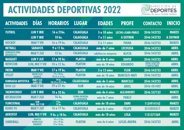 En la grilla figuran básquet, gimnasia artística, handball, gimnasia para adultos, fútbol, hockey, netball, newcom, patín, recreación, shi lu, taekwondo y voley.