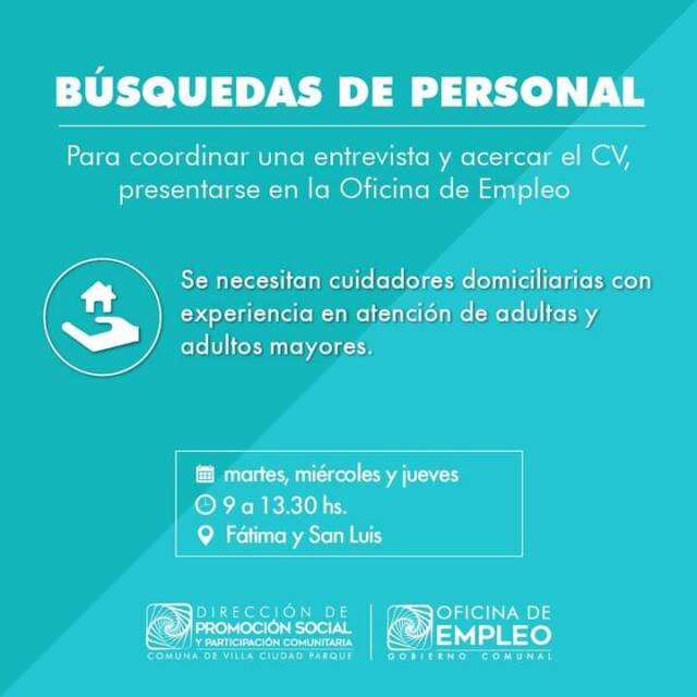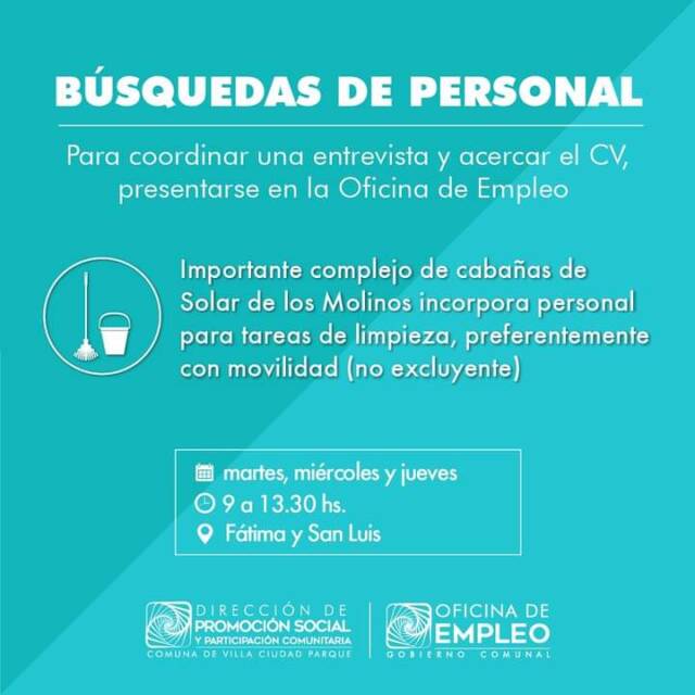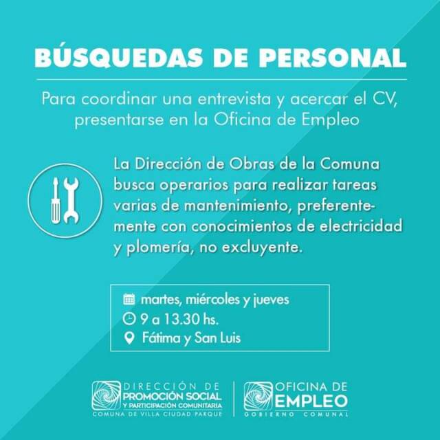 La Oficina de Empleo de Villa Ciudad Parque, dependiente de la Dirección de Promoción Social y Participación Comunitaria, informa a la comunidad sobre nuevas búsquedas laborales para diferentes espacios públicos.