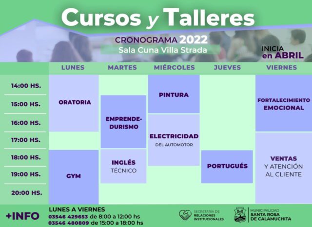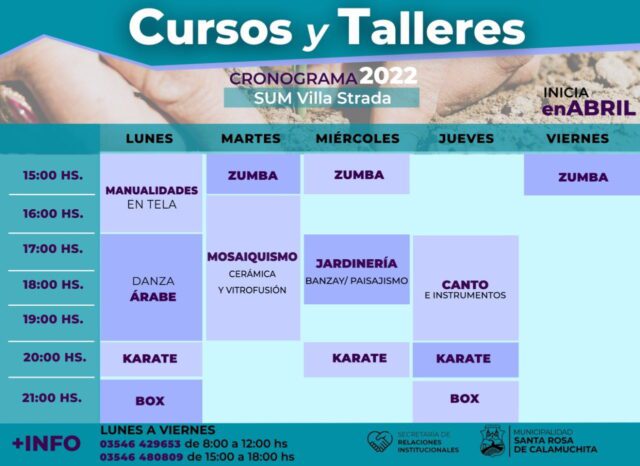 Como cada año, la Secretaría de Relaciones Institucionales de la Municipalidad de Santa Rosa de Calamuchita lanza una amplia grilla de cursos y talleres de formación, que se brindan en varios espacios de la localidad.