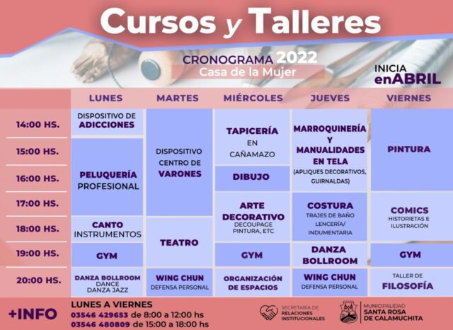 Los cursos y talleres comienzan en el mes de abril. Las inscripciones van desde hoy 17 y hasta el 25 de marzo. Y se pueden realizar consultas en la Casa del Bicentenario de 8:00 a 12:00 hs, al teléfono de contacto 03546-429653 de 8:00 a 12:00 hs, en la Casa de la Mujer de 15:00 a 18:00 hs. o también al número 03546-1480809 de 15:00 a 18:00 hs.