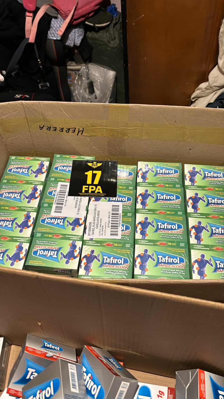 En el procedimiento se secuestraron una máquina de contar billetes, $23.403.000 pesos argentinos, así como un total de 1.926 cajas, 874 blíster sueltos, 74 botellas, 18 sobres y 328 comprimidos de psicofármacos y medicamentos. Todos ellos en distintas presentaciones correspondientes a reconocidas marcas comerciales como Tafirol, Sertal, Actron, Buscapina, Ibuprofeno, Diclofenac, Amoxidal, Bayaspirina, Novalgina y Paracetamol, entre otras.