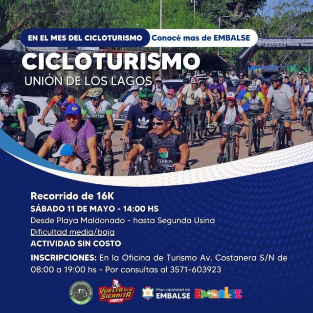 El sábado 11, se desarrollará la pedaleada “Unión De Los Lagos”, en el marco del mes del cicloturismo en Córdoba. Es una actividad sin costo y para toda la familia, tendrá 16 km. de recorrido desde Playa Maldonado hasta Segunda Usina.