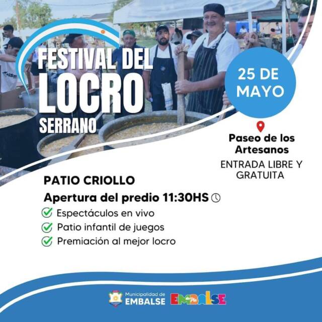Por último, el sábado 25 desde las 11:30 hs. en el Paseo de Los Artesanos y con entrada libre y gratuita, se desarrollará el Festival del Locro Serrano, con espectáculos en vivo y donde habrá una premiación al mejor locro.