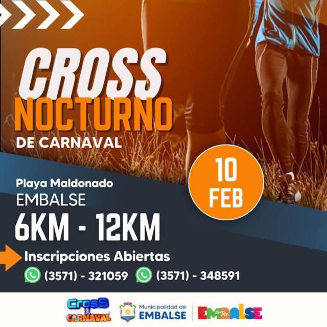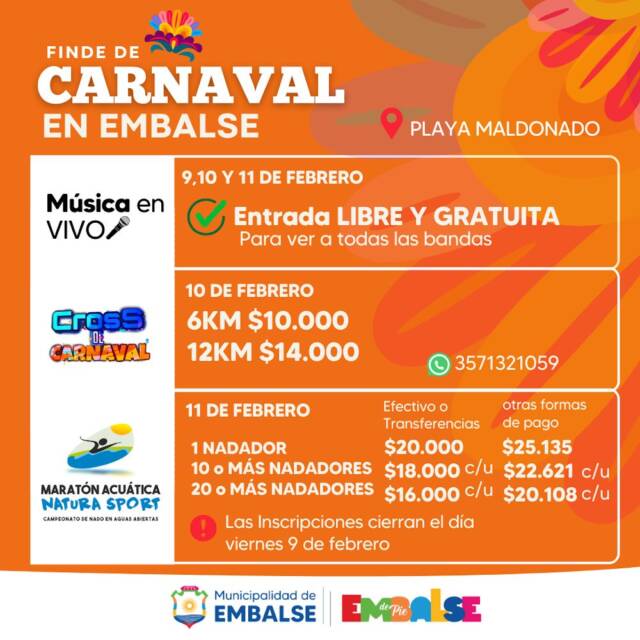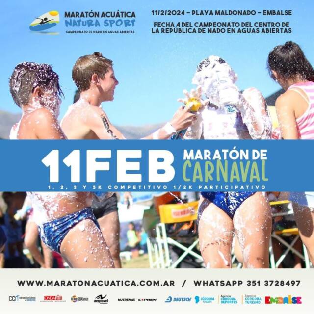 Los eventos deportivos serán Cros Nocturno de Carnaval y Maratón Acuática de Carnaval, con costos que van desde los 10.000 y los 20.000 pesos. Para mayor información comunicarse al 3571321059 para el Cross Nocturno y al 3513728497 para la Maratón Acuática.