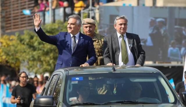 El gobernador estuvo acompañado por el intendente Renato Raschetti, miembros del gabinete provincial, funcionarios y dirigentes locales, legisladores y autoridades de las Fuerzas Armadas, entre otros.
