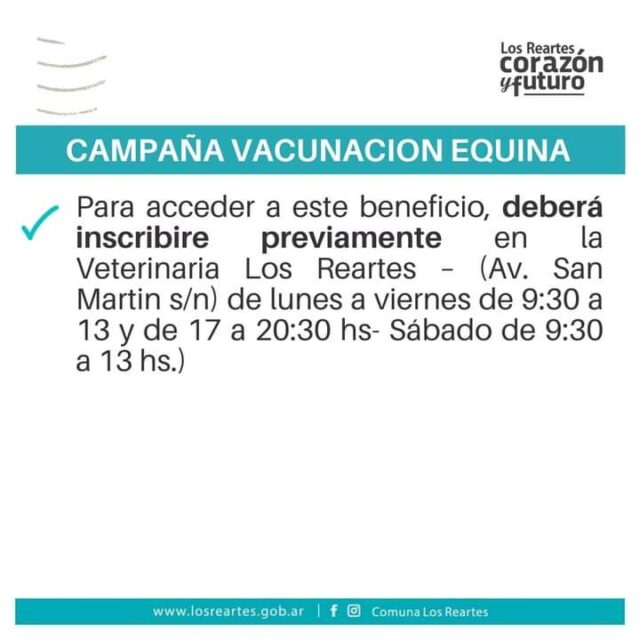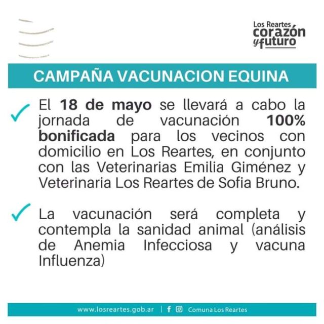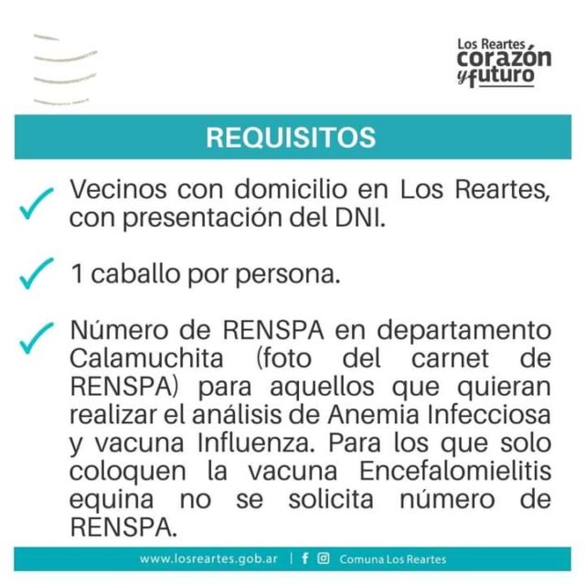 La localidad de Los Reartes ofrece una jornada de vacunación gratuita contra la Encefalomielitis Equina para los vecinos del lugar, en conjunto con las Veterinarias Emilia Giménez y Veterinaria Los Reartes de Sofia Bruno.