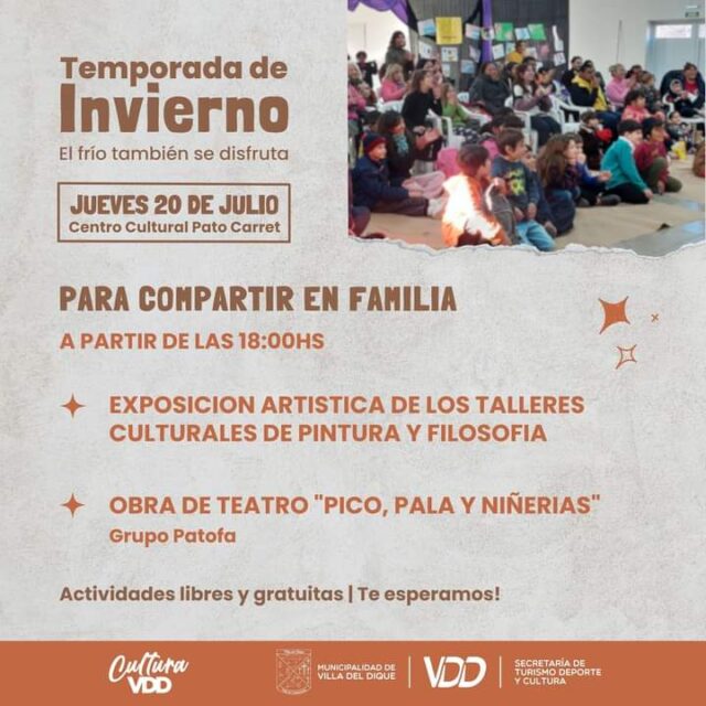 • Exposición Artística: Jueves 20 de julio a partir de las 18horas. Centro Cultural Pato Carret. A cargo de los Talleres Municipales de pintura y filosofía. Obra de teatro «Pico, Pala y Niñerías». Grupo Patofa.